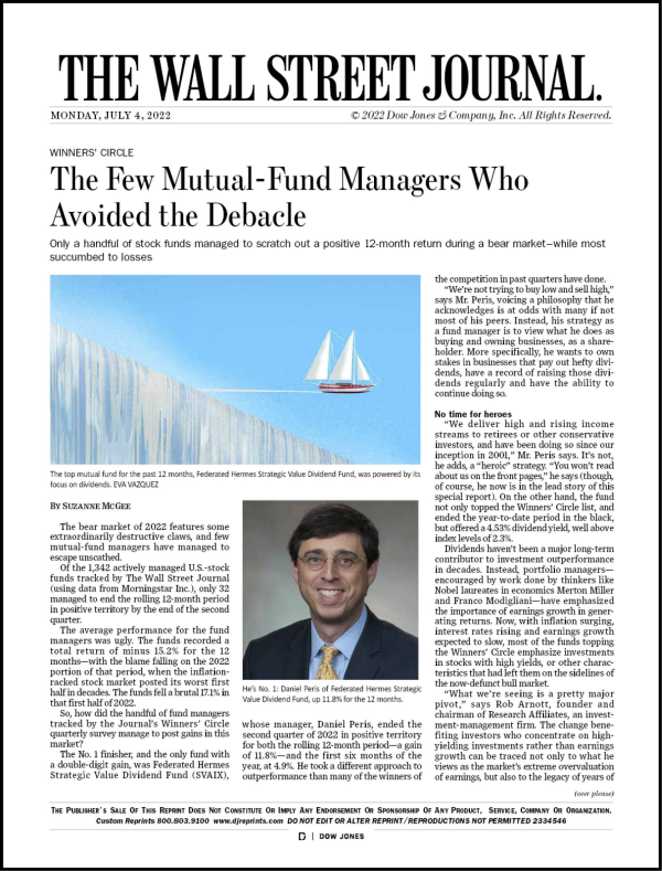 The Fund’s top 10 holdings represented 38.40% of the Fund as of 6/30/22: Abbvie 7.23%, Broadcom 5.74%, Verizon 4.36%, Pfizer 3.33%, Coca-Cola 3.19%, JPMorgan 3.14%, Kimberly-Clark 3.13%, NextEra Energy 2.83%, Merck & Co 2.82%, Philip Morris 2.63%; Referred companies represented 14.20% of the Fund: Broadcom 5.74%, Verizon 4.36%, Philip Morris 2.63%, Exxon Mobil 1.47%, Gilead Sciences 0.00%, General Electric 0.00%, General Mills 0.00%, Microsoft 0.00%; The portfolio may or may not hold and is not restricted to the holdings listed.